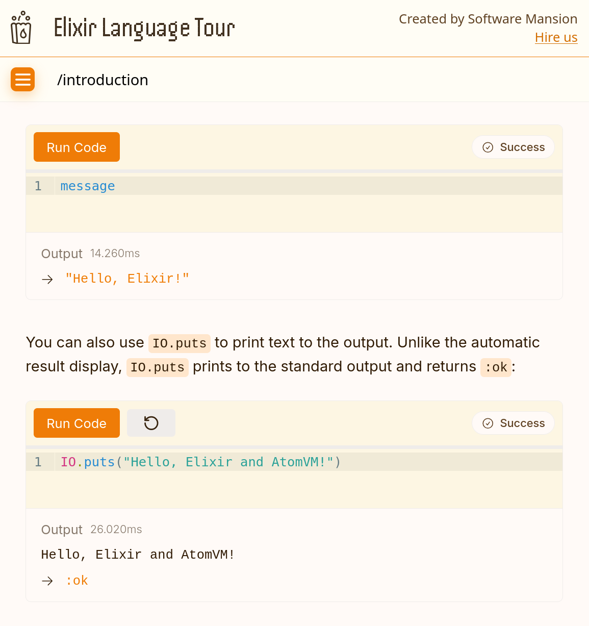 Speaking of simple but effective applications, the Elixir Language Tour is one of them: you open a web page and you can start learning Elixir immediately, no local install required, just type and run. That’s a big deal for learning and onboarding.