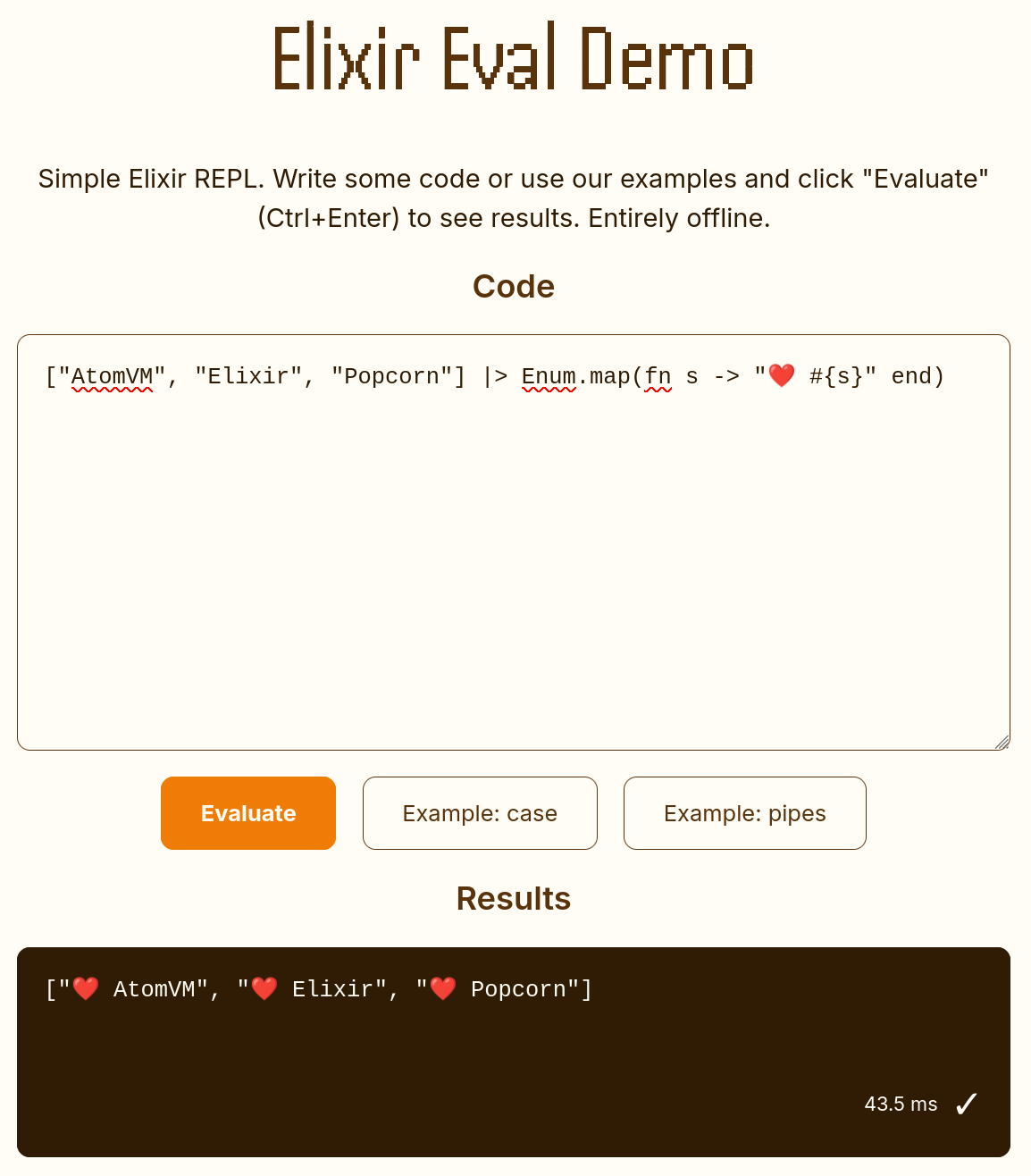 Popcorn lets you run client-side Elixir in the browser, with JavaScript interoperability. Under the hood, it runs AtomVM compiled to WebAssembly, and wraps it with the tooling and APIs needed to build real front-end experiences.